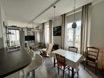 Dans un ancien hôtel particulier entièrement rénové à Roubaix, magnifique appartement T3 en angle et trés lumineux de 55 m2 avec de belles hauteurs sous plafond. L'intérieur compte un espace de vie avec une cuisine équipée, 2 chambres avec dressing, une belle salle de bains... La superficie habitable mesure 54.46m2 en loi Carrez. Construction en 2004. Il s'agit d'un bien au 1e étage d'un immeuble de 3 niveaux. Il s'accompagne d'un espace de stockage sur trois caves privatives en sous-sol. Des fenêtres à double vitrage assurent le calme du lieu. La propriété vous fait profiter d'au moins un garage avec possibilité de garer une voiture et un deux roue. Avec un prise de courant pour de votre véhicule électrique. 90 euros de charges de corpopriété mensuelles. Copropriété de 20 appartements. Métro et voie rapide à proximité.