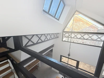 Au rdc un superbe séjour cuisine équipée qui s'articule autour d'un patio terrasse de 30m2 , une buanderie, un superbe escalier fait sur mesure vous invite à l'étage où se trouve 3 chambres avec salle de bain ,possibilité d'une deuxième salle d'eau ,une place parking complète ce loft