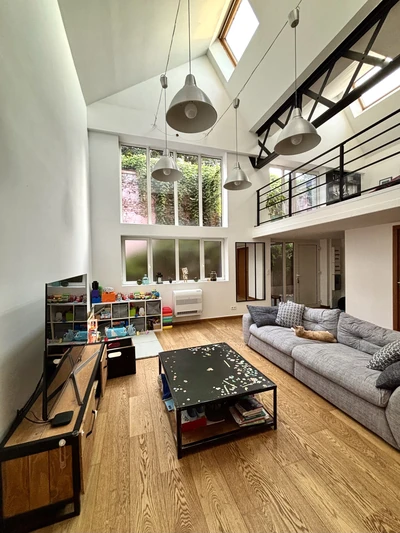 Au Rdc : Une belle pièce de vie lumineuse,esprit atelier,avec de belles hauteurs sous plafond