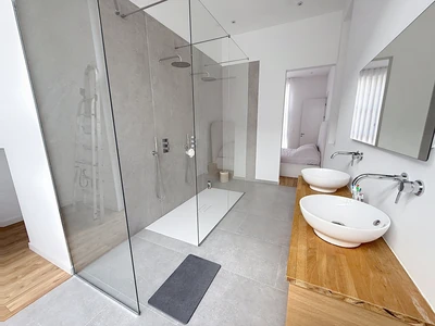 Une deuxième salle de bain avec douche et baignoire, toujours dans un esprit luxe et sobriété.